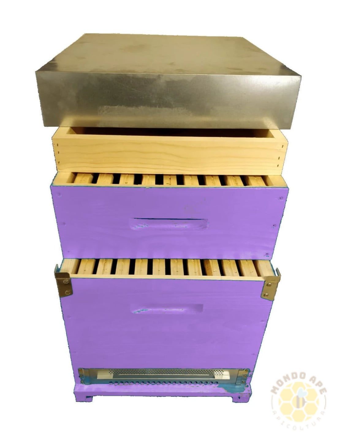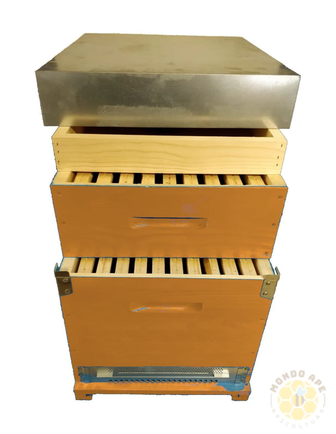 Il kit comprende già tutta la ferramenta dell'arnia (già montata), melario, 10 telaini da nido e 9 da melario (armati di filo)