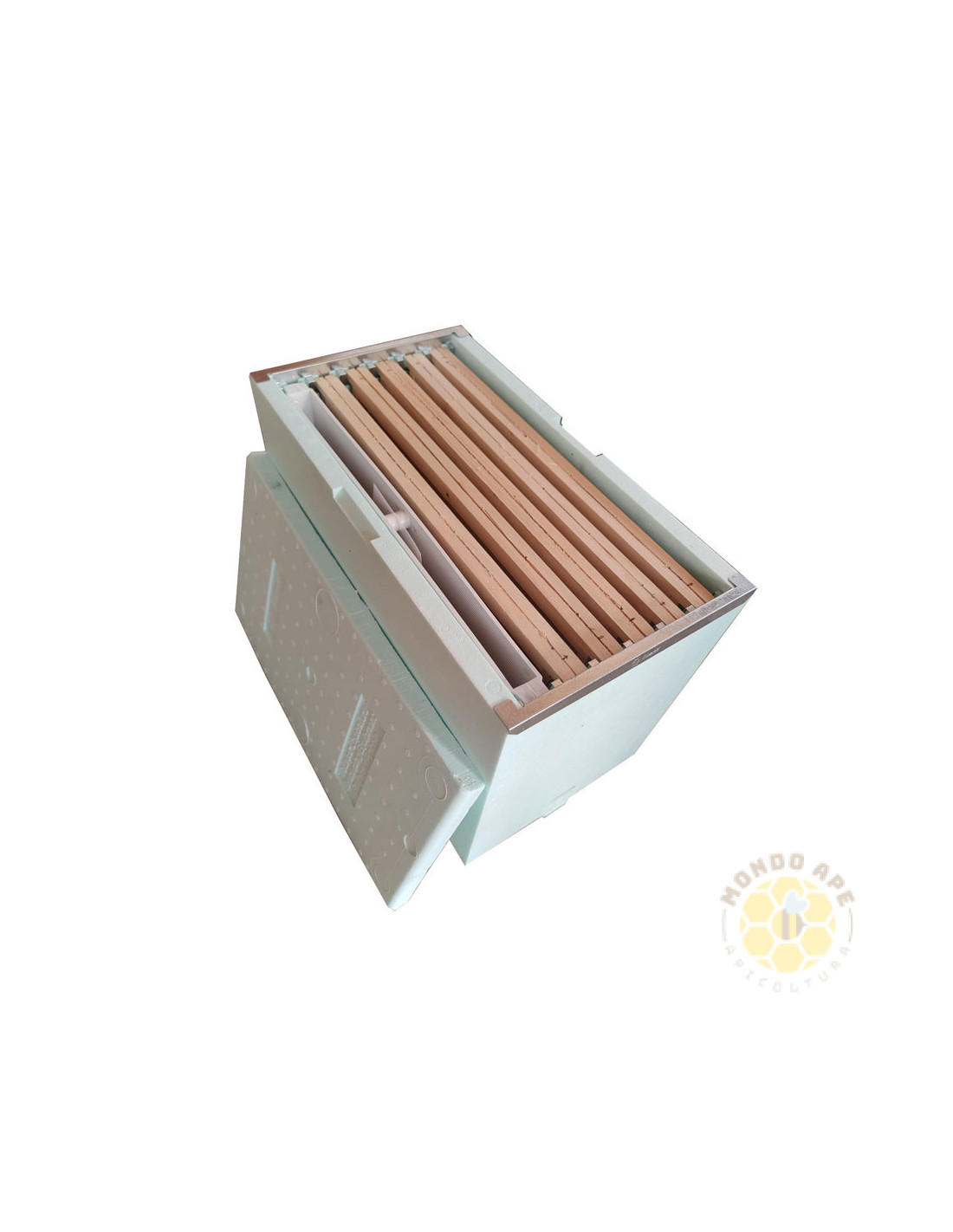 Il Kit Sciamatura è configurato per le operazioni di recupero sciami e per la creazione di nuovi nuclei. La dotazione comprende un'arnia in polistirolo, materiale leggero con buone proprietà isolanti, adatta al trasporto e alla gestione temporanea dello sciame.