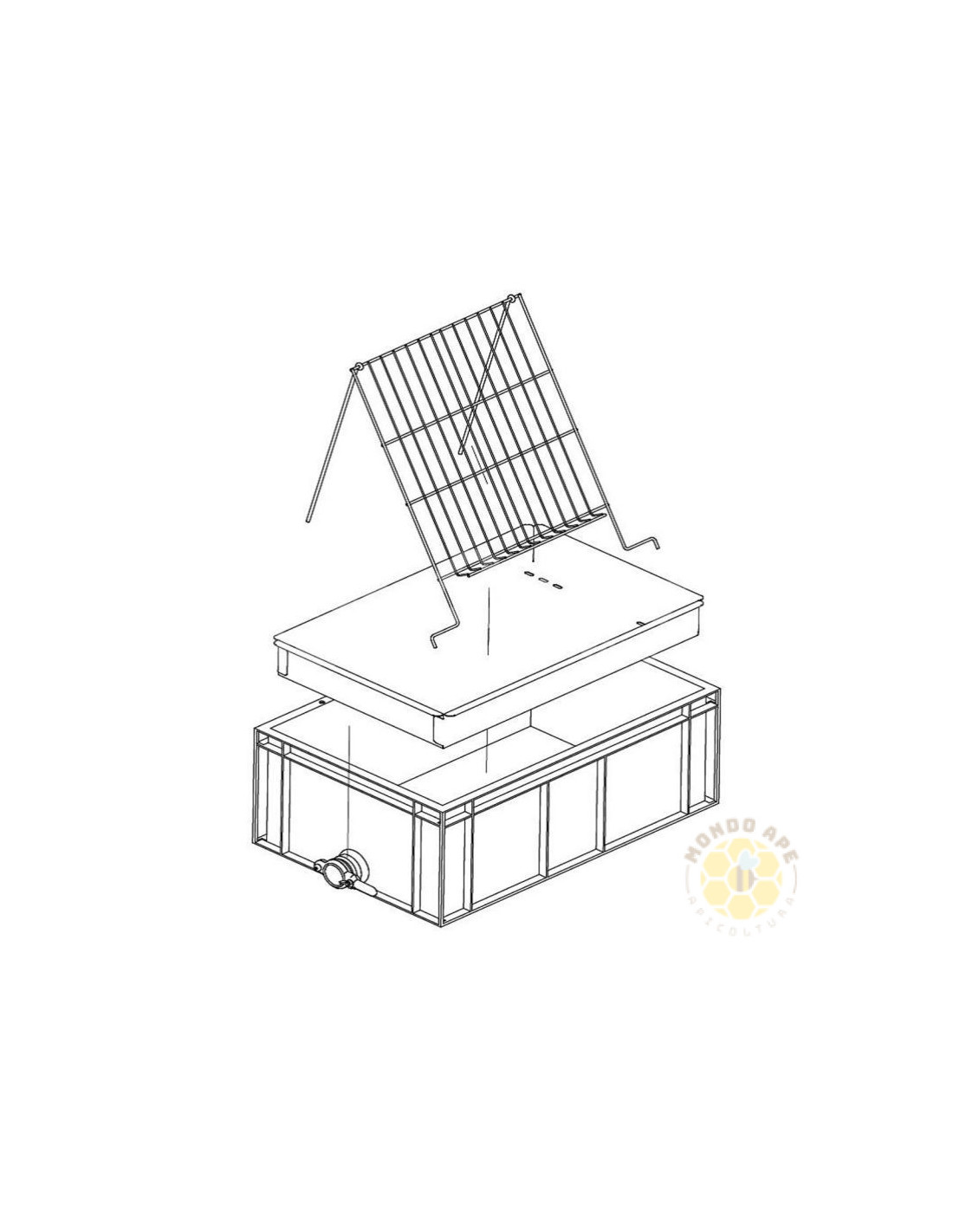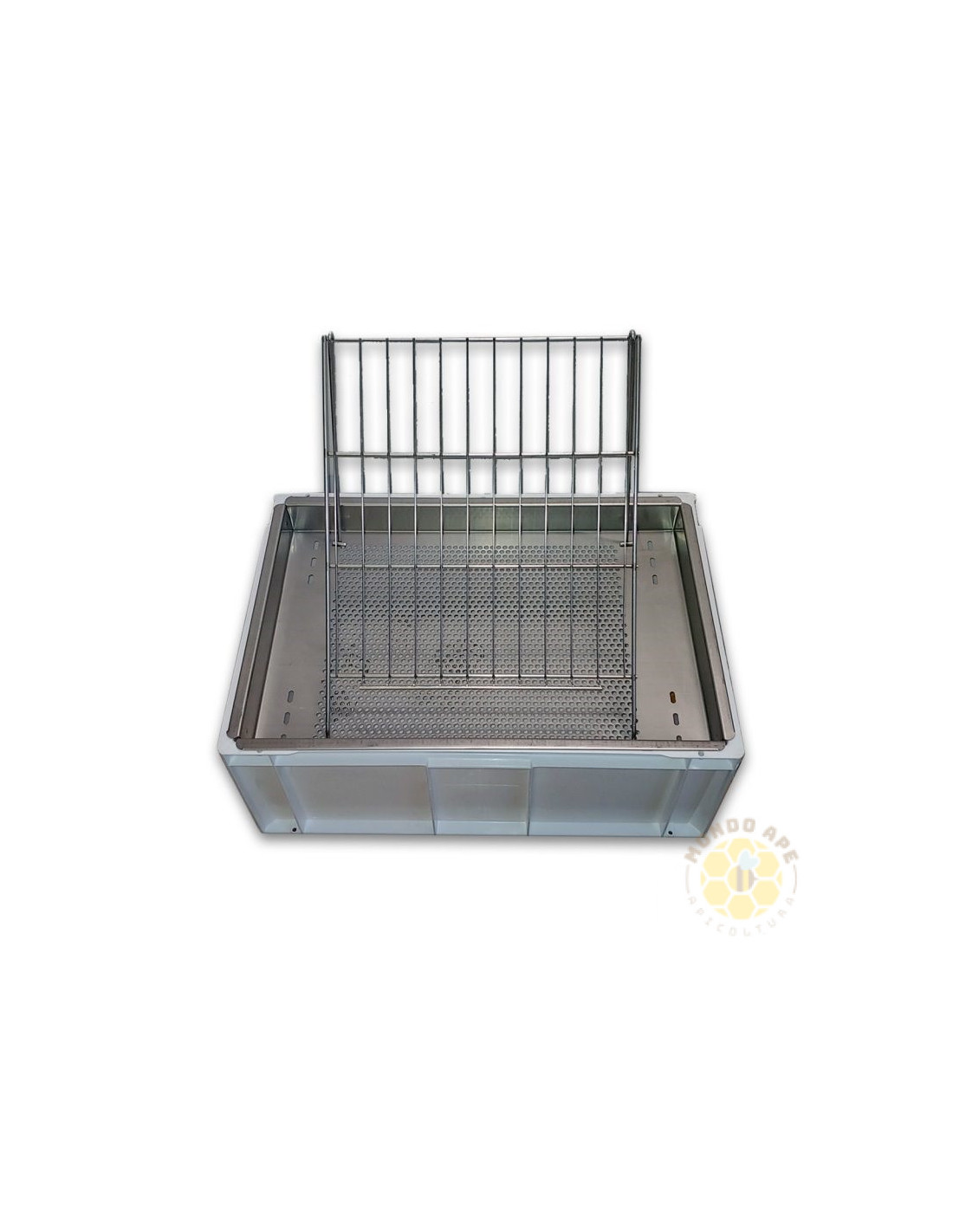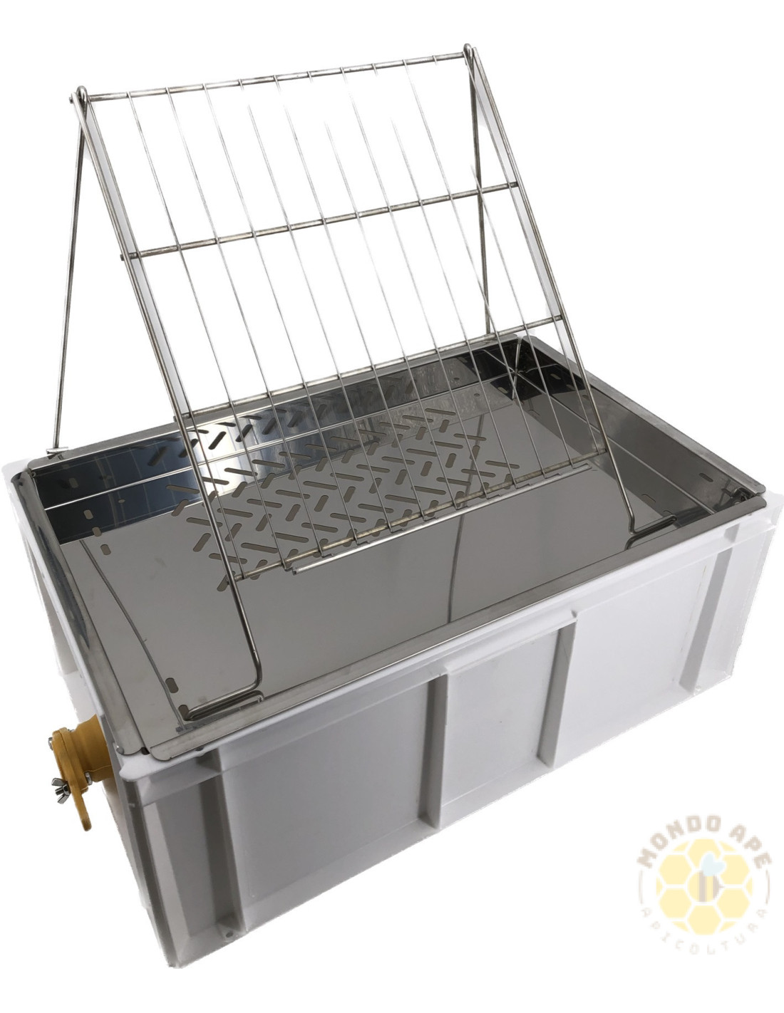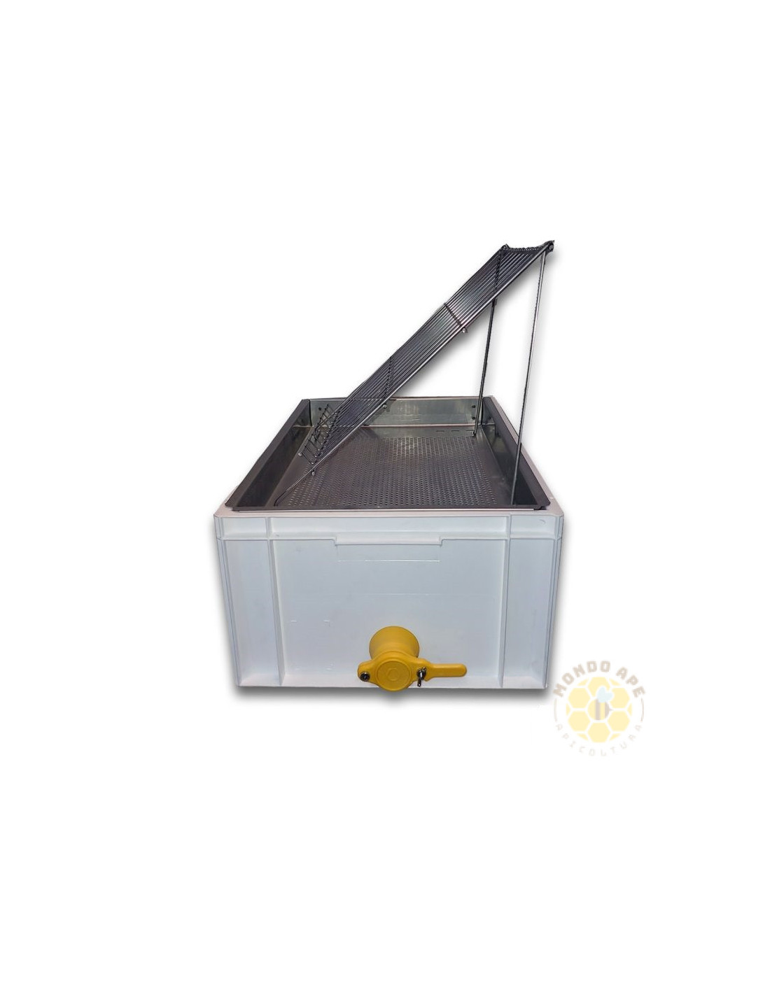 Appoggia il telaino sul banco e rimuovi facilmente gli opercoli grazie alla struttura stabile e capiente. Il fondo raccoglie il miele che scola, facilitando il successivo trattamento.