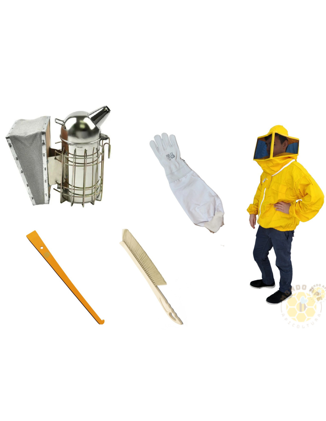 Il kit base apicoltura riunisce gli strumenti fondamentali per iniziare le attività in apiario in condizioni operative adeguate. La composizione del kit copre le principali esigenze di protezione personale e gestione dell'arnia durante le ispezioni.