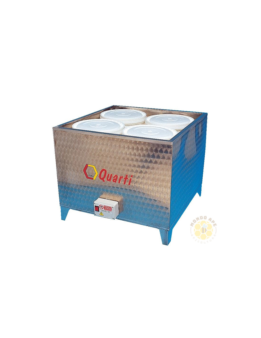 Il fondimiele può contenere fino a 4 latte di miele ed è fornito di supporto interno per i secchi, che ne garantisce la corretta posizione durante il riscaldamento. Il coperchio con maniglia anticalore rende l'utilizzo pratico e sicuro anche durante le fasi di lavoro.