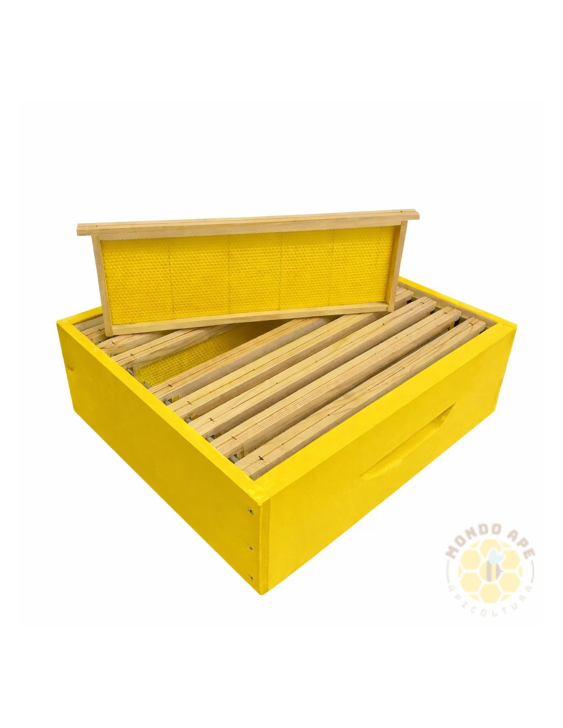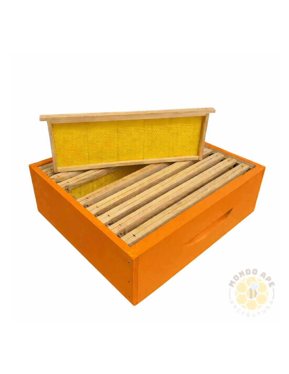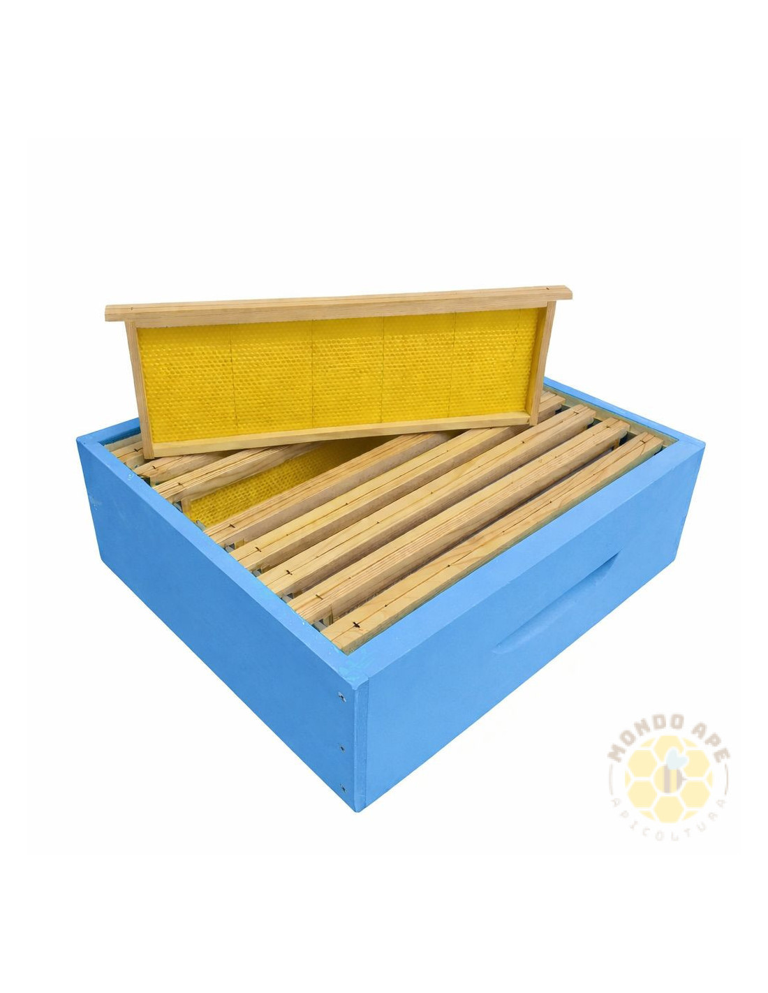 Viene fornito completo di 9 telaini, ciascuno con foglio cereo già applicato.