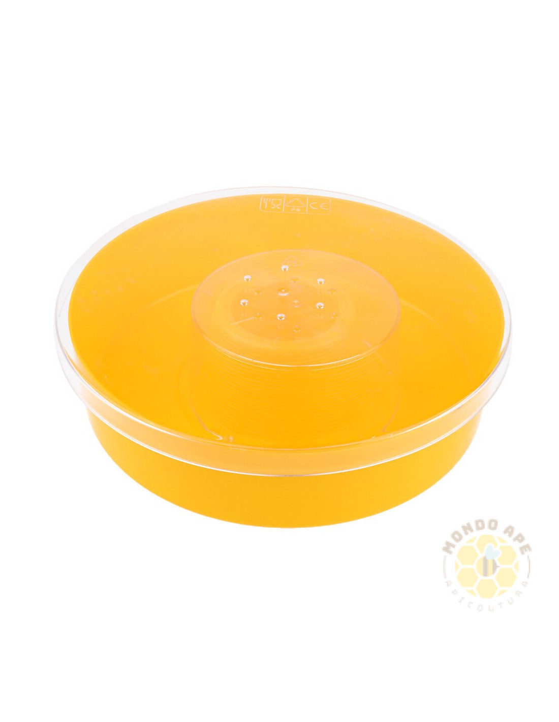 Realizzato in plastica morbida, è fornito completo di bicchierino interno e coperchio, che permettono una distribuzione sicura dell'alimento. Il nutritore si posiziona sul coprifavo, aprendo il disco a 4 posizioni per consentire l'accesso delle api al nutrimento.