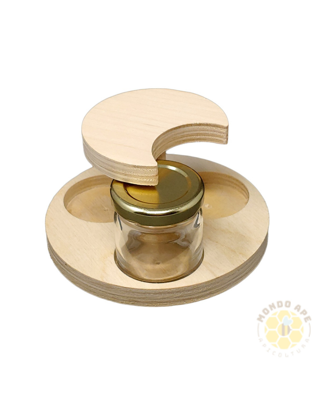 Espositore in legno multistrato e faggio, pensato per ospitare fino a 5 vasetti di miele da 50 g.