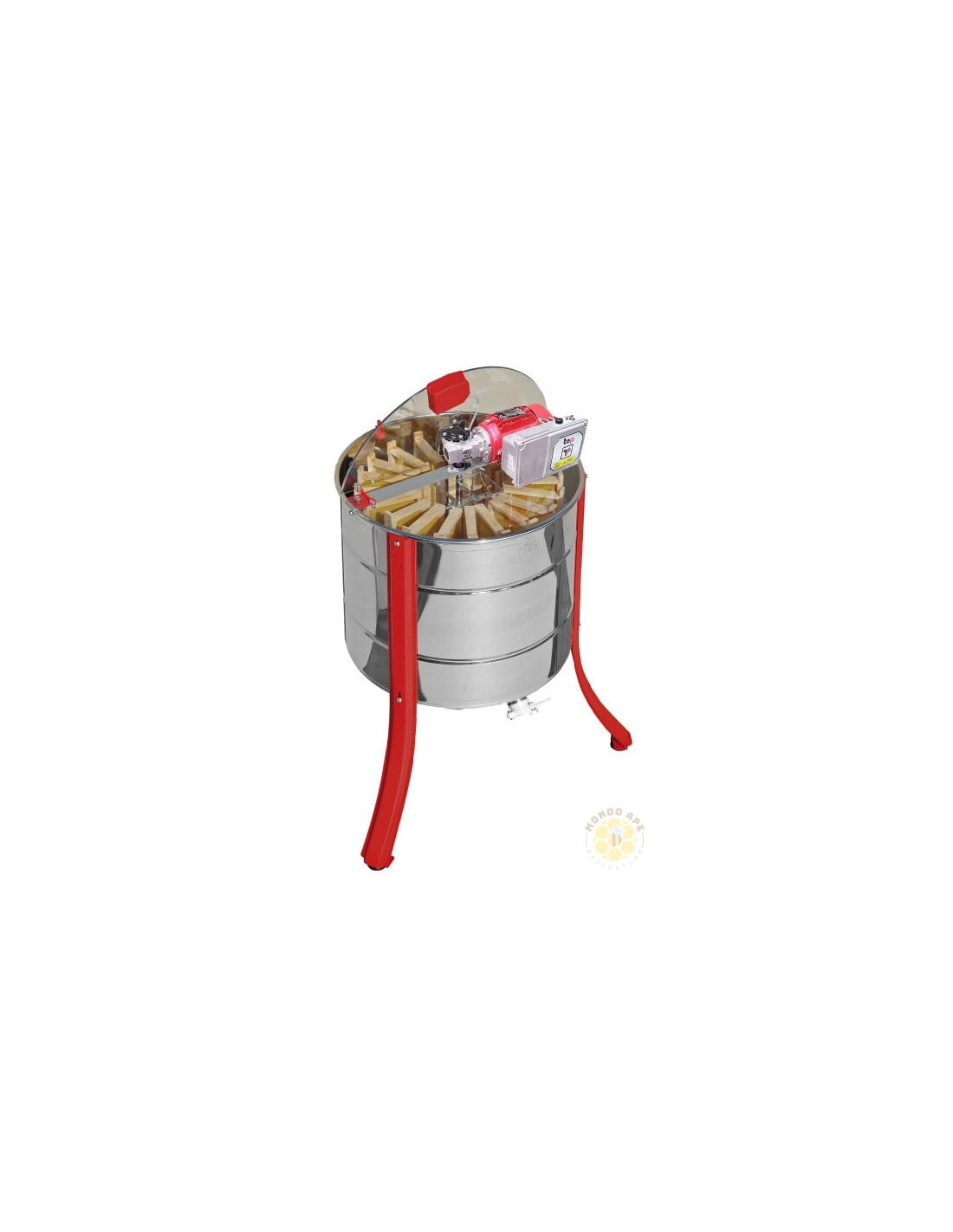 Il modello è dotato di motore elettrico TOP2, fissato sulla sbarra superiore, con regolatore di velocità per controllare la rotazione in base al tipo di miele e alle esigenze di estrazione. Il coperchio trasparente in policarbonato, incernierato alla sbarra, è completo di nuovo dispositivo di sicurezza a sblocco immediato, per lavorare in modo pratico e sicuro mantenendo sempre visibile il processo.
