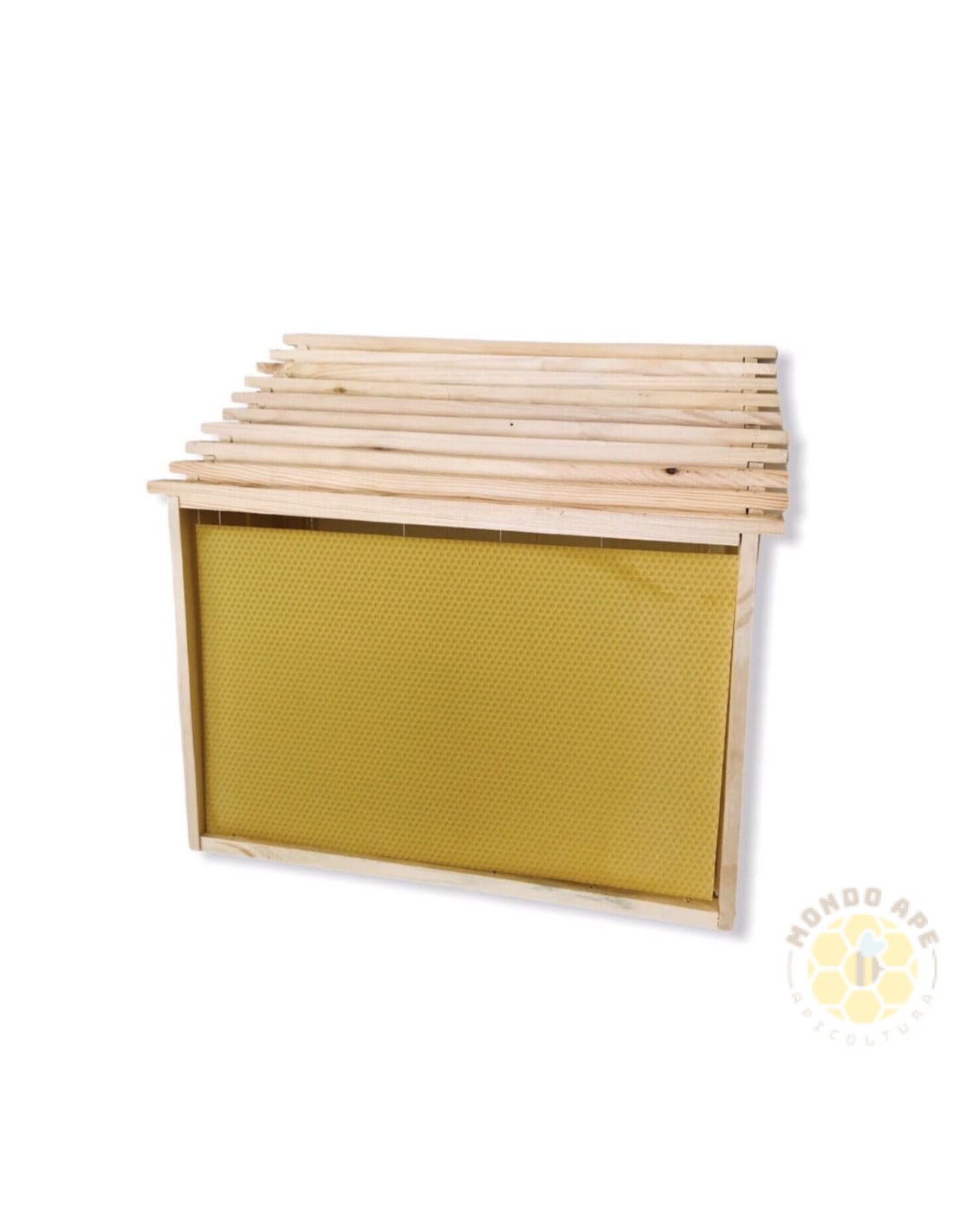 10 telaini da nido modello Dadant, già montati e pronti all'uso, con foglio cereo in pura cera d'api italiana applicato manualmente.